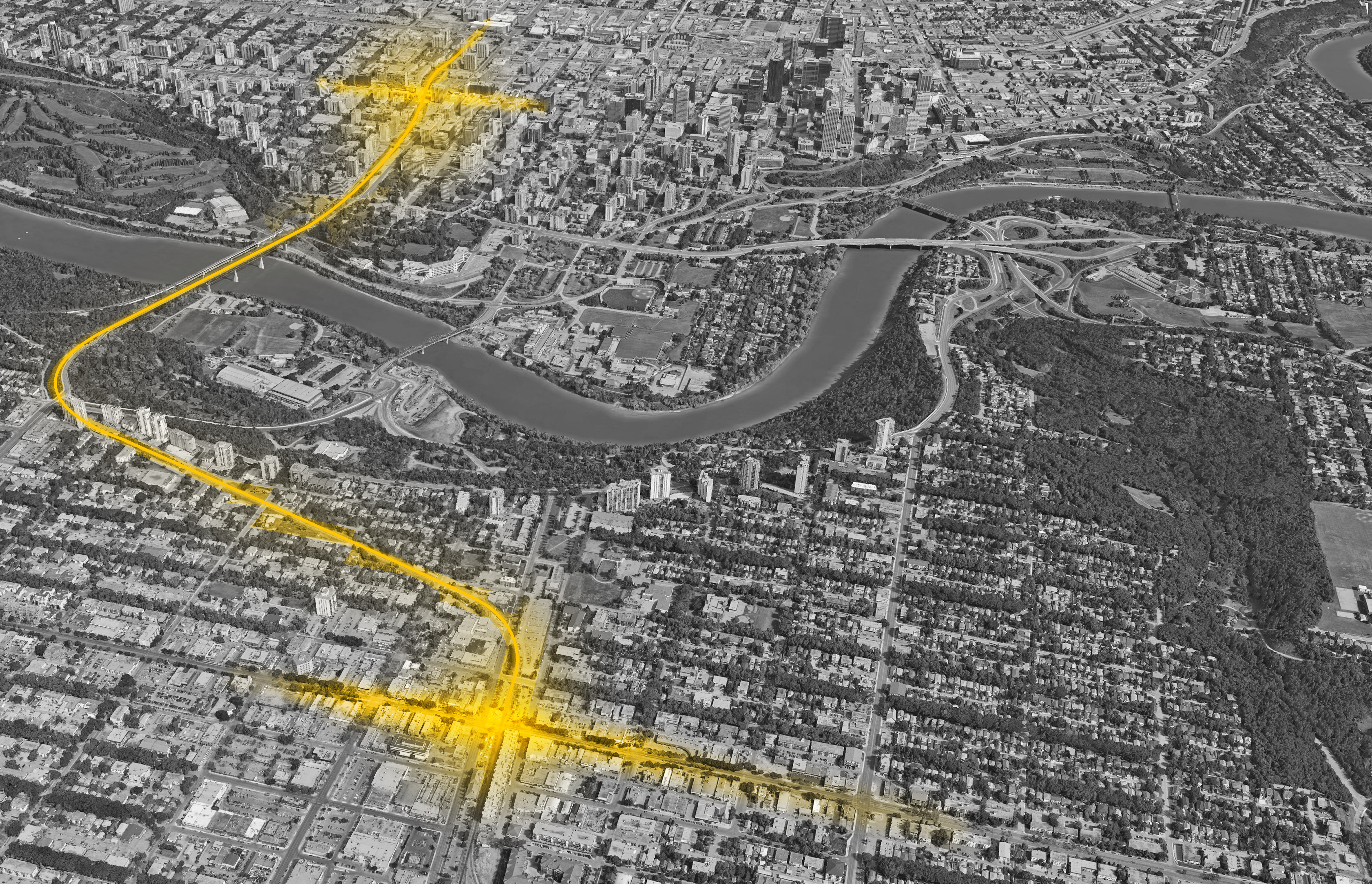 The High Level Line is a proposed 4.3 kilometre linear park between Oliver and Old Strathcona, using top deck of the High Level Bridge to connect the two sides.