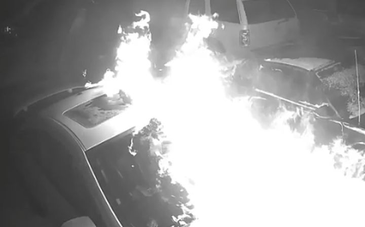 Four seconds of surveillance video released by police shows a person walk up to a car in what appears to be a parking lot and then extend their arm and before appearing to use a lighter to ignite the car. The video then shows an explosion of light and the outside of the car is covered in flames as the person runs away.