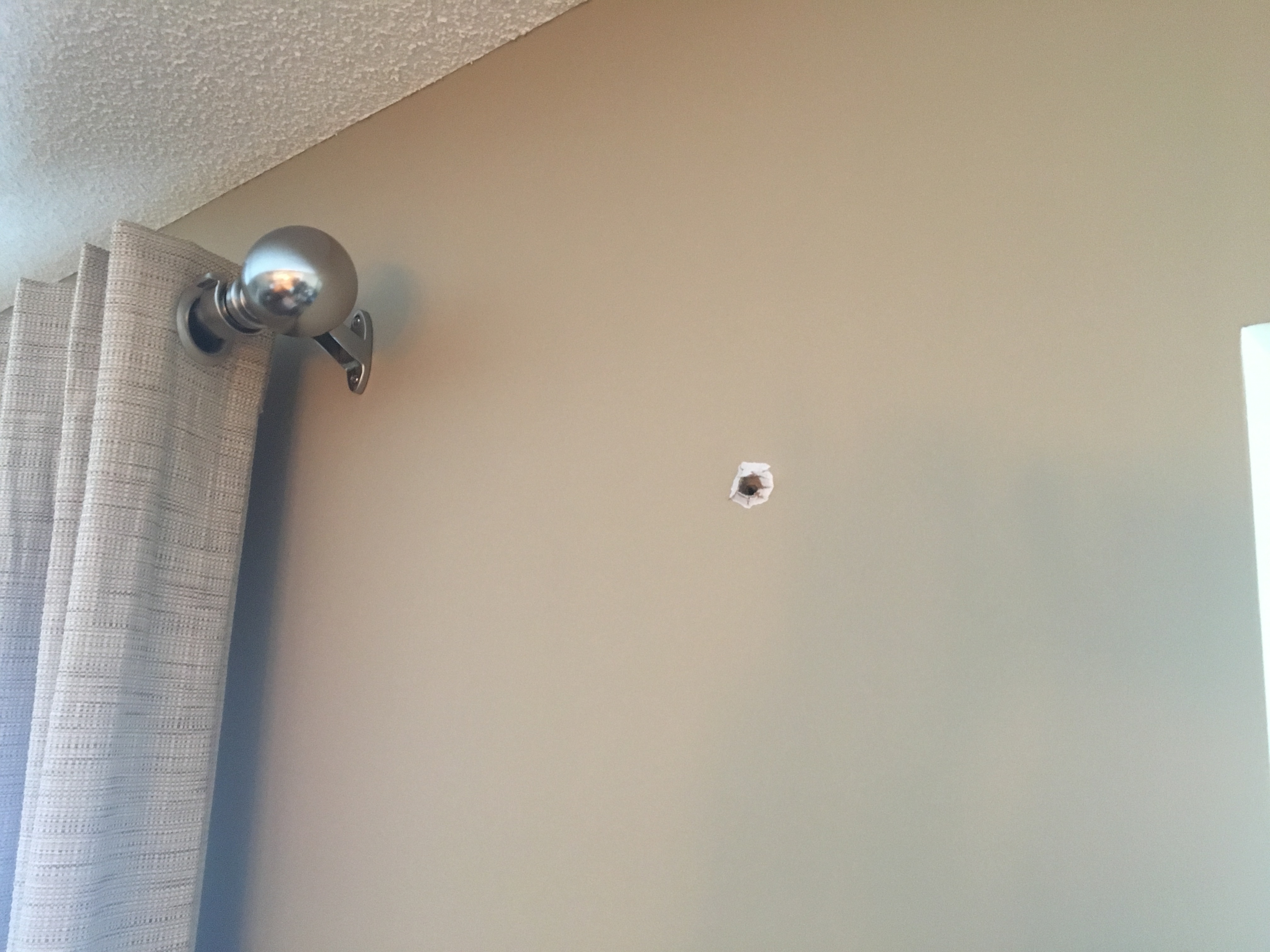 Photos from the home show a small bullet hole in the siding on the outside of the home, a hole in an inside wall near a curtain rod and a hole in a kitchen cupboard.
