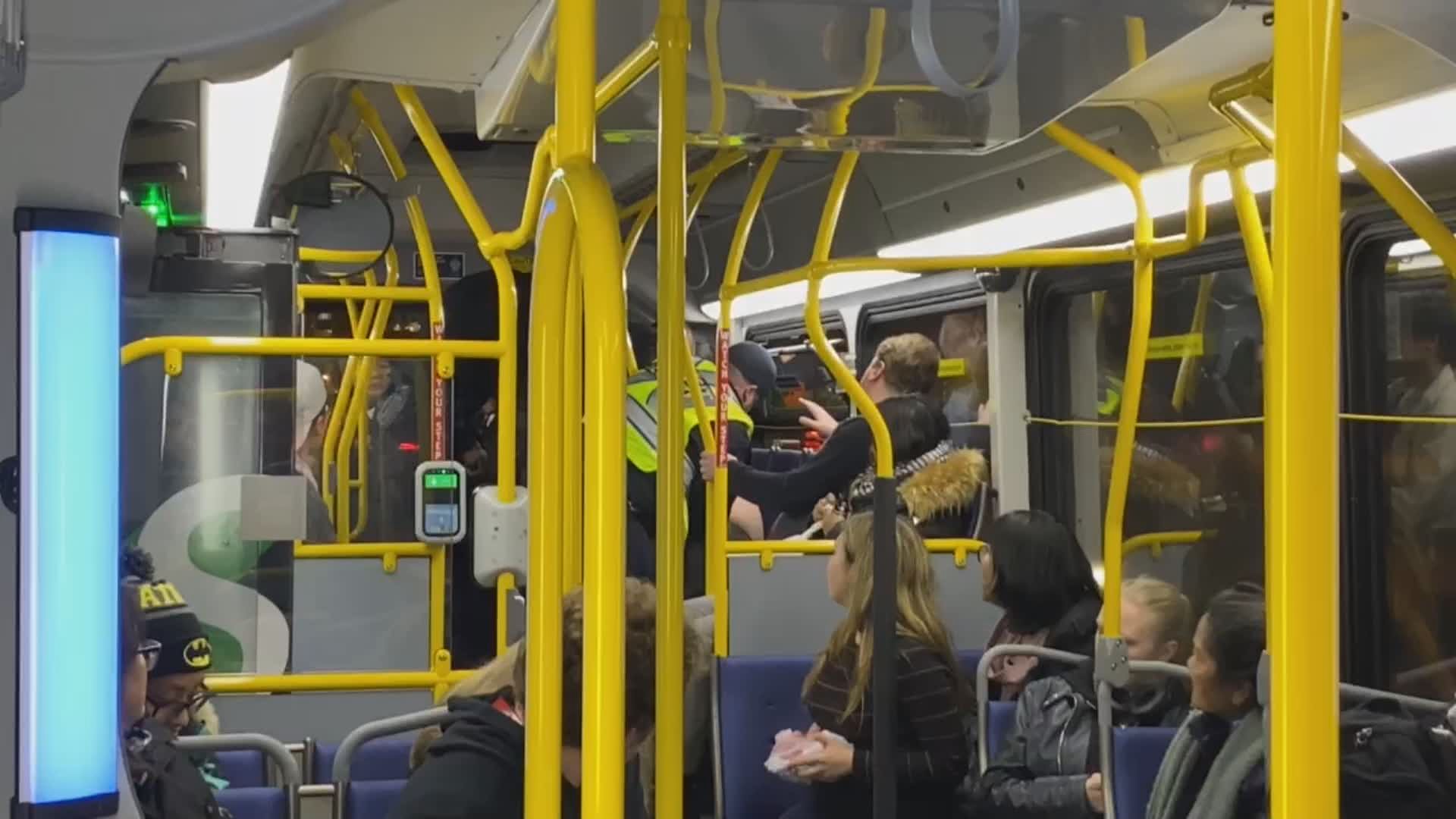 Video of the incident shows a cluster of transit security officers around a man in the back of the bus.
