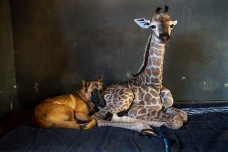 Resident watchdog Hunter seemed to realize something was wrong and didn’t leave the baby giraffe’s side, and was there when he died, the orphanage said. The dog then sat in front of the empty room for hours before going to its carers “for comfort.”