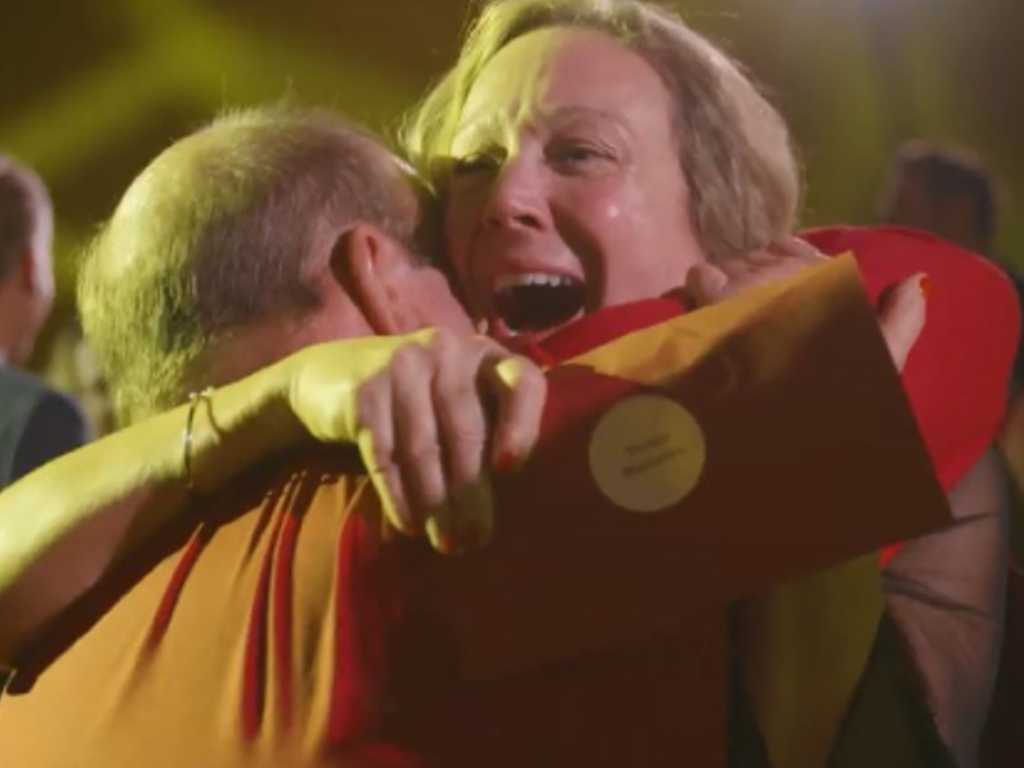 The camera pans around the banquet hall, catching the emotional moments full of happy tears.
