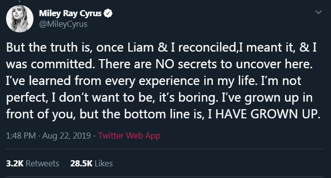 “But the truth is, once Liam & I reconciled,I meant it, & I was committed. There are NO secrets to uncover here. I’ve learned from every experience in my life. I’m not perfect, I don’t want to be, it’s boring. I’ve grown up in front of you, but the bottom line is, I HAVE GROWN UP,” she wrote.