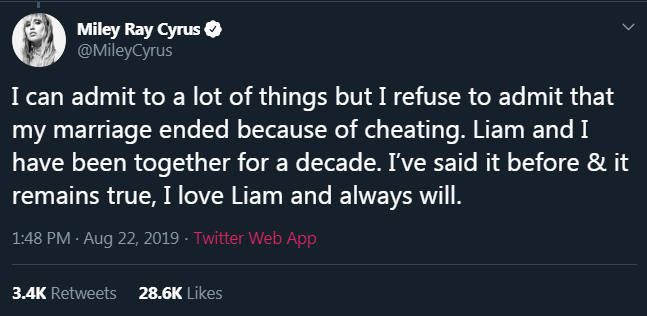 “I can admit to a lot of things but I refuse to admit that my marriage ended because of cheating. Liam and I have been together for a decade. I’ve said it before & it remains true, I love Liam and always will.”