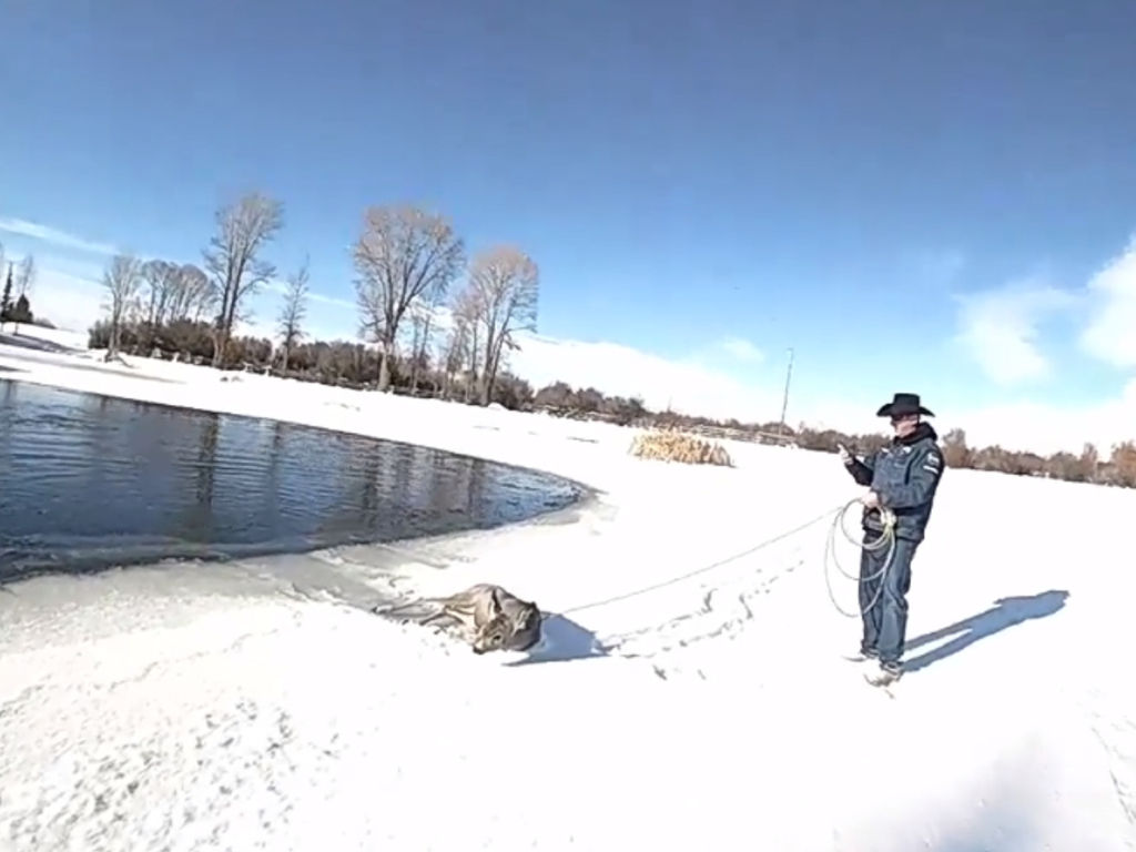 Video shows Wyoming deputies rescuing deer from ice-covered pond