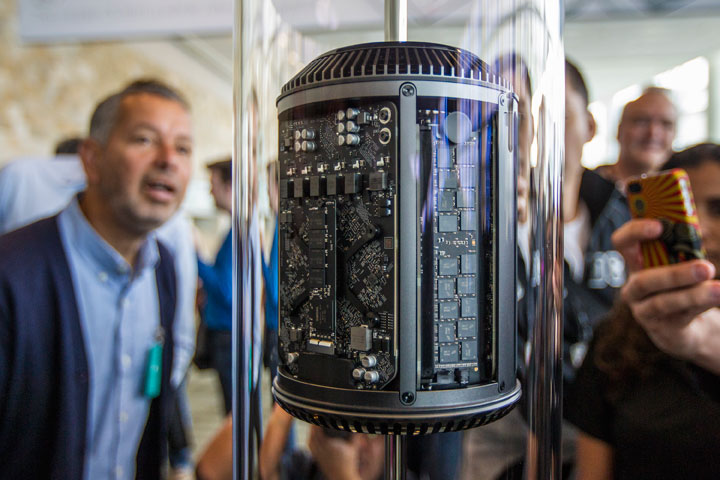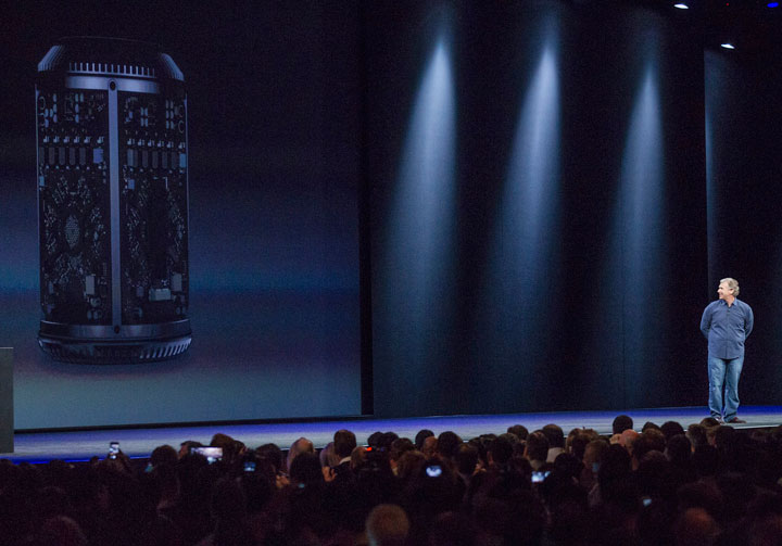 Apple also revealed a complete revamp of the Mac Pro, the boxy desktop model that’s the work horse of graphics and film professionals. The new model is a black cylinder, one eighth the volume of the old box.