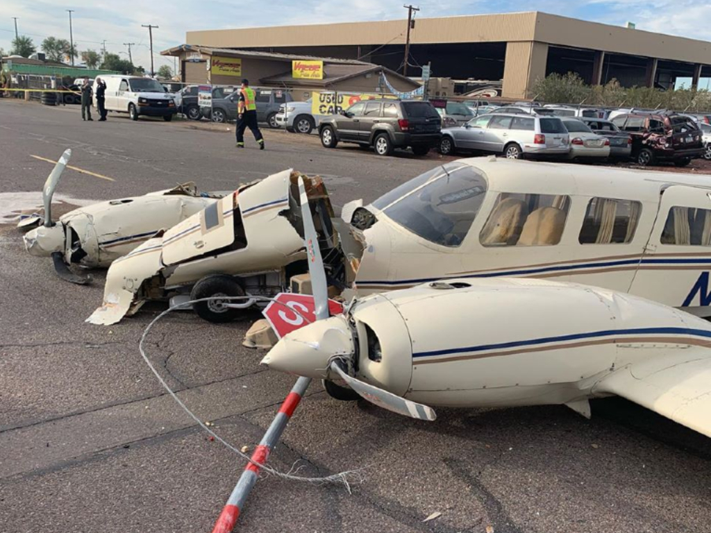 Around 15 minutes later, ABC15 says, the same aircraft made an emergency descent, crashing into cars before landing abruptly in a used car lot.