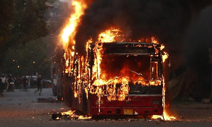 The third day of what had been a peaceful demonstration against the law, passed by India’s Parliament last week, descended into chaos Sunday afternoon. Three buses were set on fire, police officials said.
