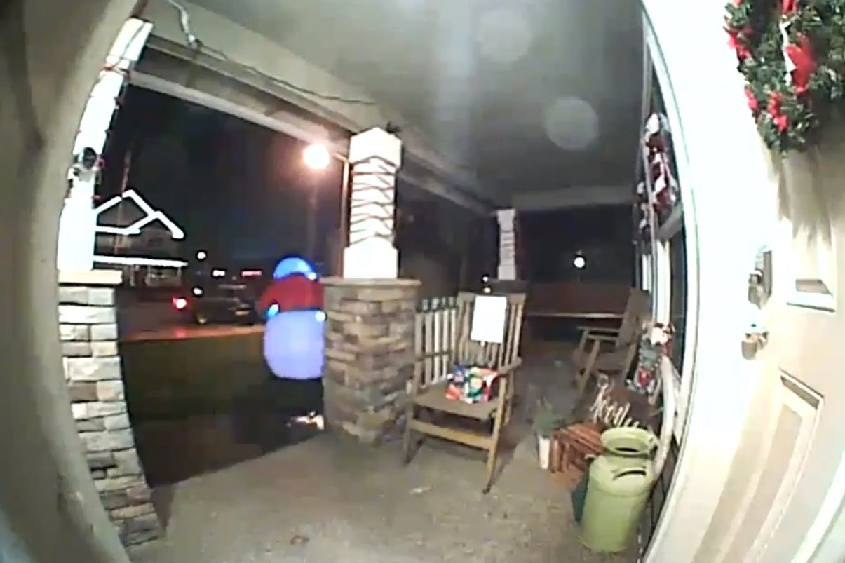 In the video, a black pickup truck rolls up in front of the house and a dark figure jumps out of the passenger’s side door. The figure runs up the inflatable snowman and briefly disappears from view, just as the snowman shudders from an apparent blow.