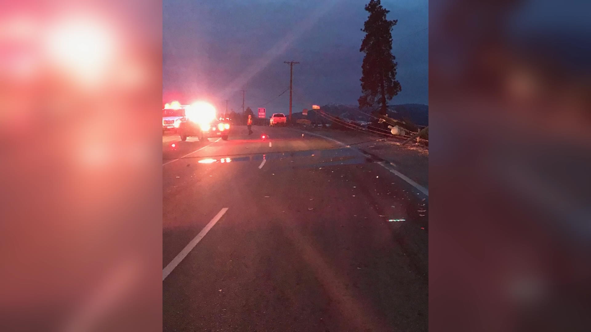 Highway 97 in Winfield was closed in both directions after a car smashed into a power line Tuesday afternoon. However, it reopened to single-lane traffic around 9 p.m. Tuesday night.