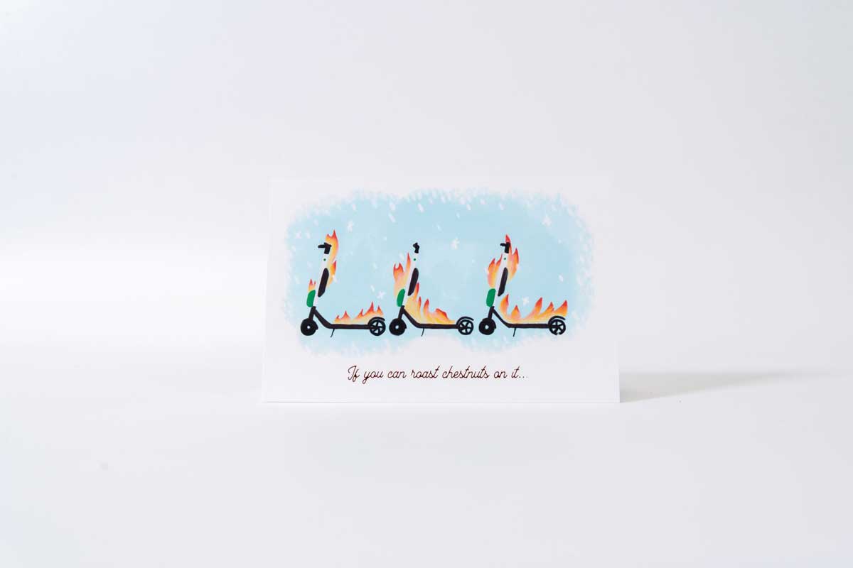 One features an angry Santa Claus swearing while stuck on the Yellowhead. Another shows a miserable snowman waiting at an ETS bus stop when it’s -30 C out. The third card shows a trio of e-scooters on fire, helping to roast chestnuts.