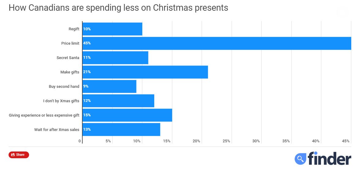 The most popular cost-saving method by far is to set a price limit, with 45 per cent of adult Canadians surveyed saying they’ll do so. Other techniques include making a gift, giving an experience or less expensive present, waiting to buy until after-Christmas sales or doing a Secret Santa.