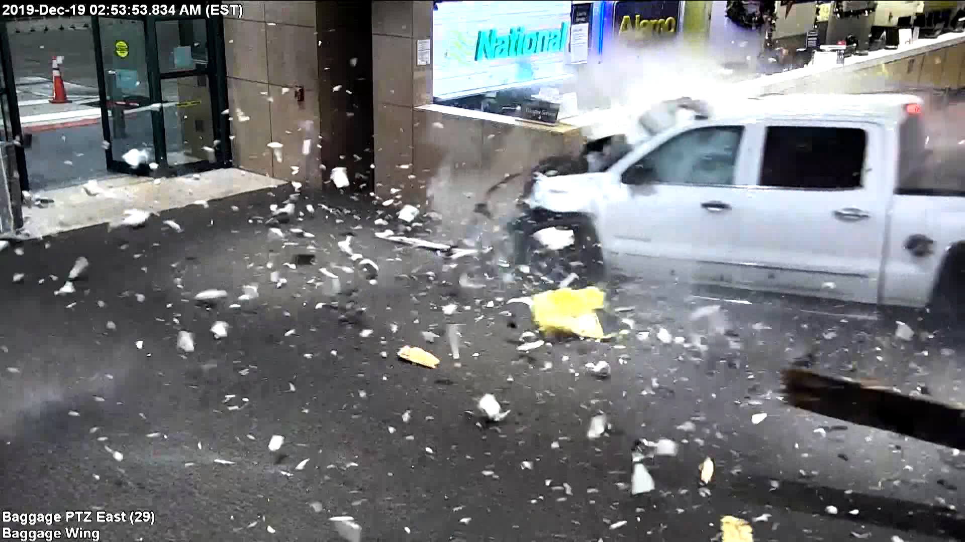 The video shows a white pickup truck bursting through a wall in the baggage carousel area of the airport, scattering debris.