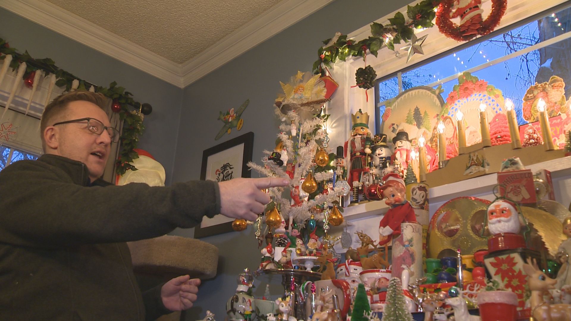Nor does he know how many Santa Claus figurines are on his mantle, from which eight stockings hang although he just shares the space with his partner and cat. Elf Village and Angel Heights are destinations atop his buffet. He easily has thousands of decorations.