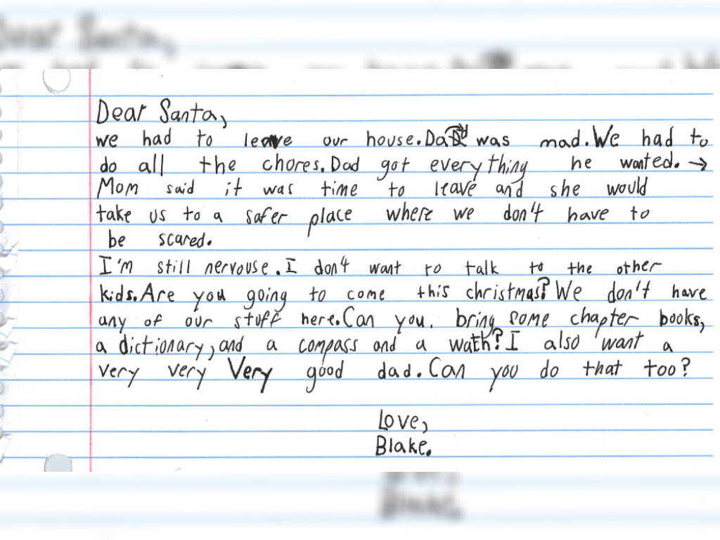 In the note, Blake writes: “We had to leave our house. Dad was mad. We had to do all the chores. Dad got everything he wanted. Mom said it was time to leave and she would take us to a safer place where we don’t have to be scared.”