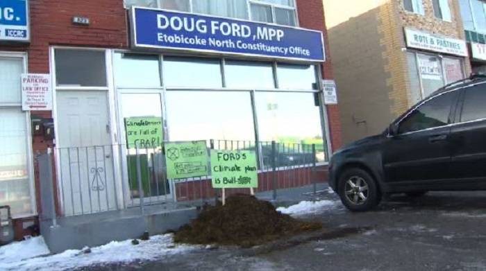 A climate activist group dumped a pile of manure at Premier Doug Ford‘s constituency office Sunday morning.