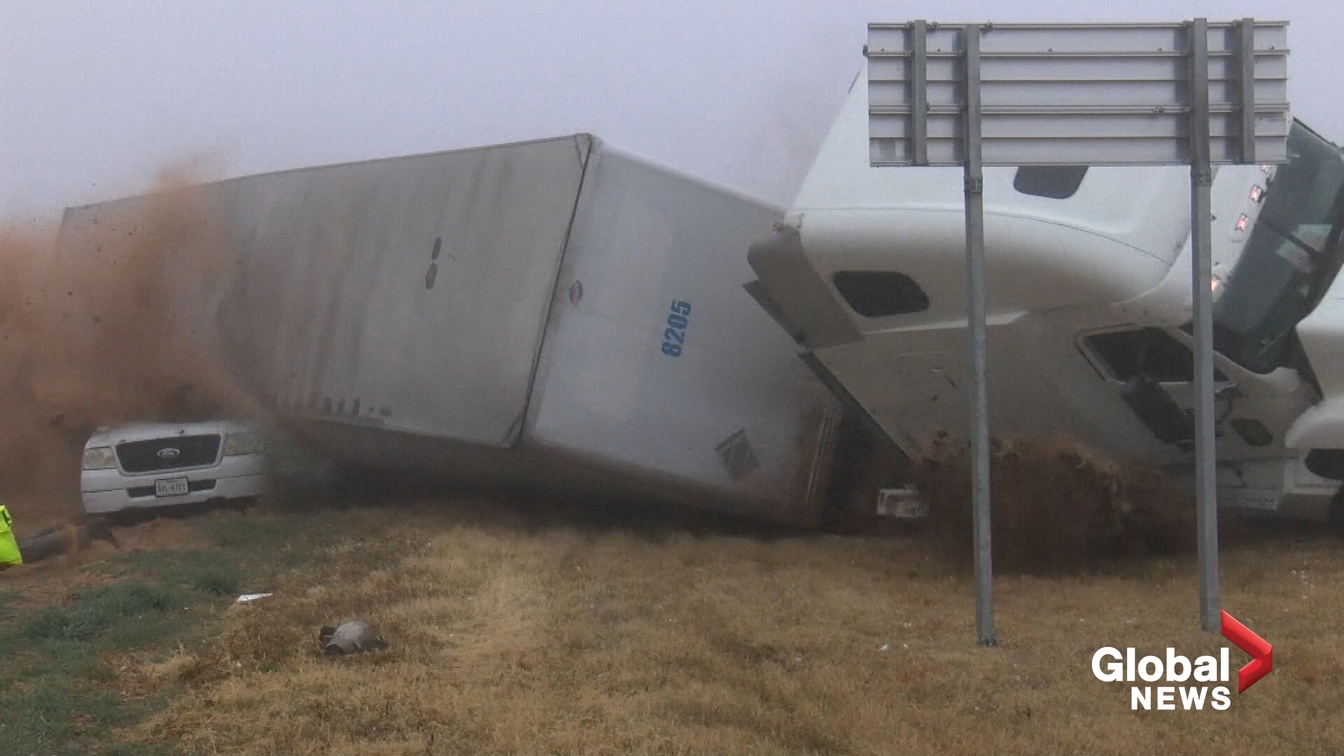 A Texas Department of Public Safety (DPS) trooper was struck by the sliding truck, while another person was trapped in their vehicle after the trailer landed on top of it.