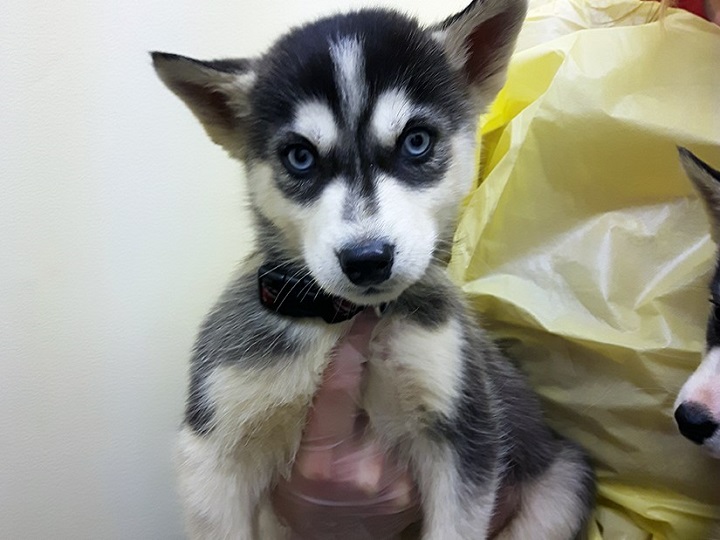 The huskies are eight to 10 weeks old, and were said to be living outside, “in the cold and snow on the property.”