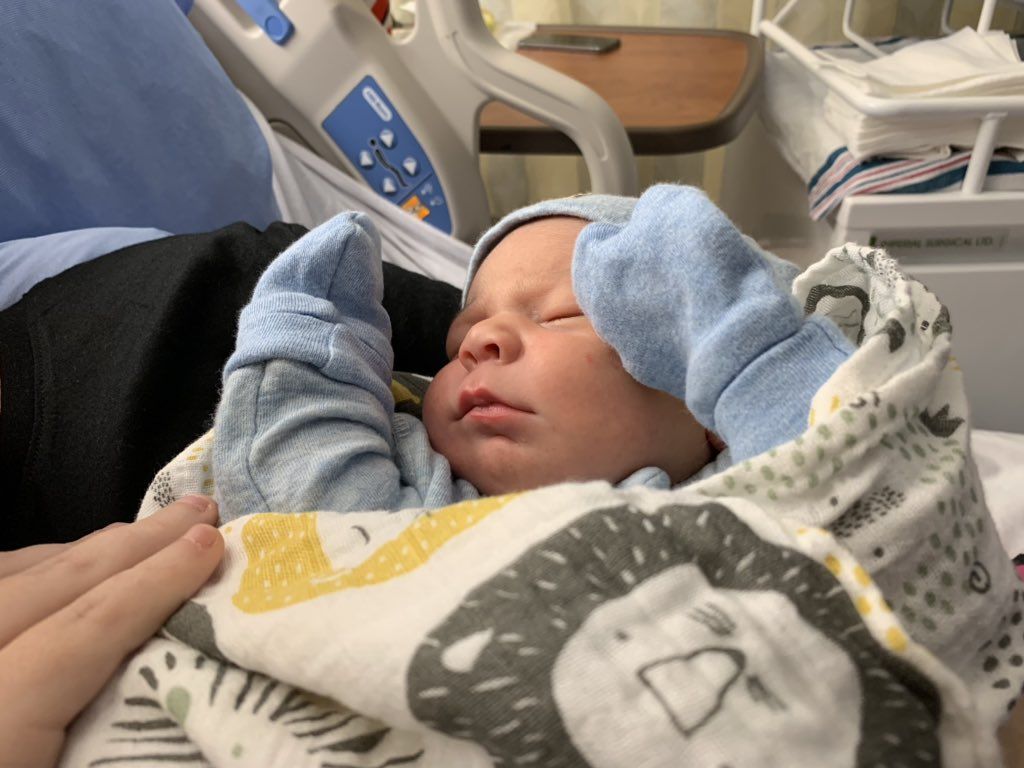 At 9 a.m., 23-year-old Stewart gave birth to little Leo Timothy Hodge Stewart at the Peterborough Regional Health Centre after undergoing a C-section.