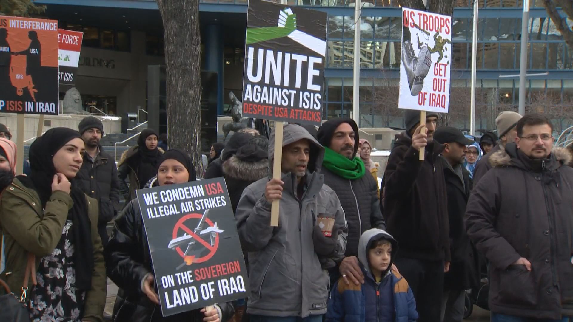 More than 100 Calgarians turned out to an anti-war protest on Saturday, speaking against the Trump administration’s decision to kill a prominent Iranian general.