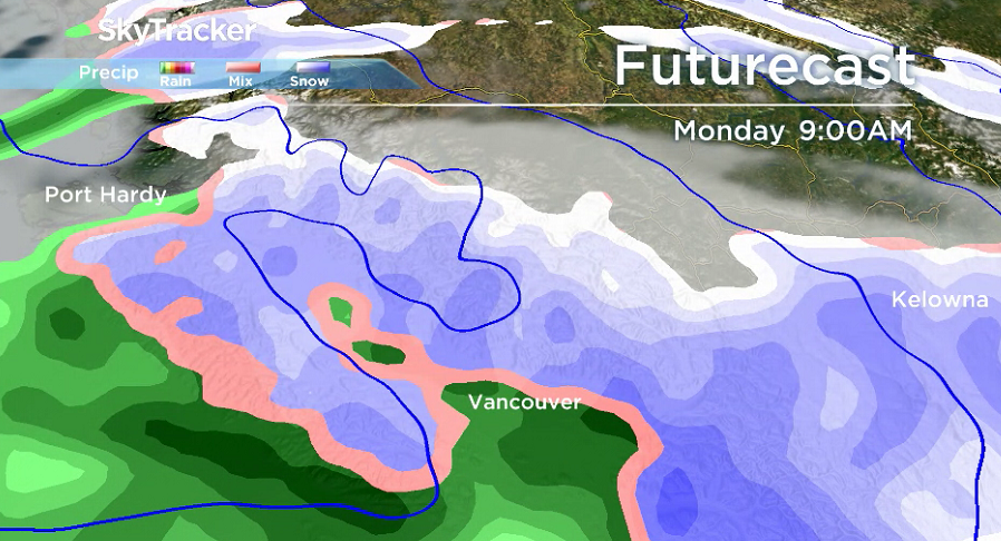 The cold front moving into B.C. is expected to last into Monday, followed by another that will push in on Tuesday and will bring even heavier rain into Wednesday.