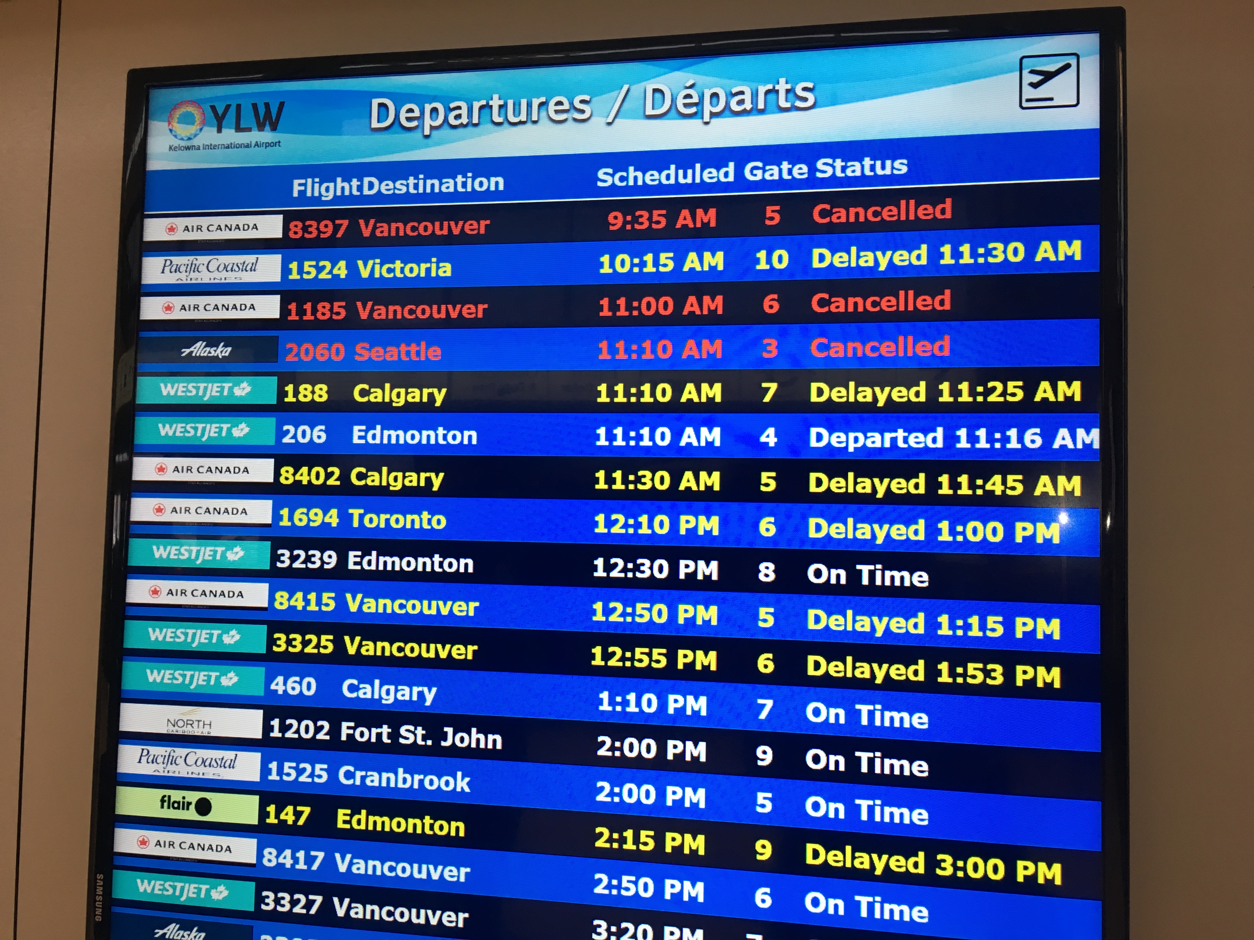 The flight schedule board at YLW is also peppered with red “delayed” markings as passengers wait an extra hour, in some cases, to catch their flights.