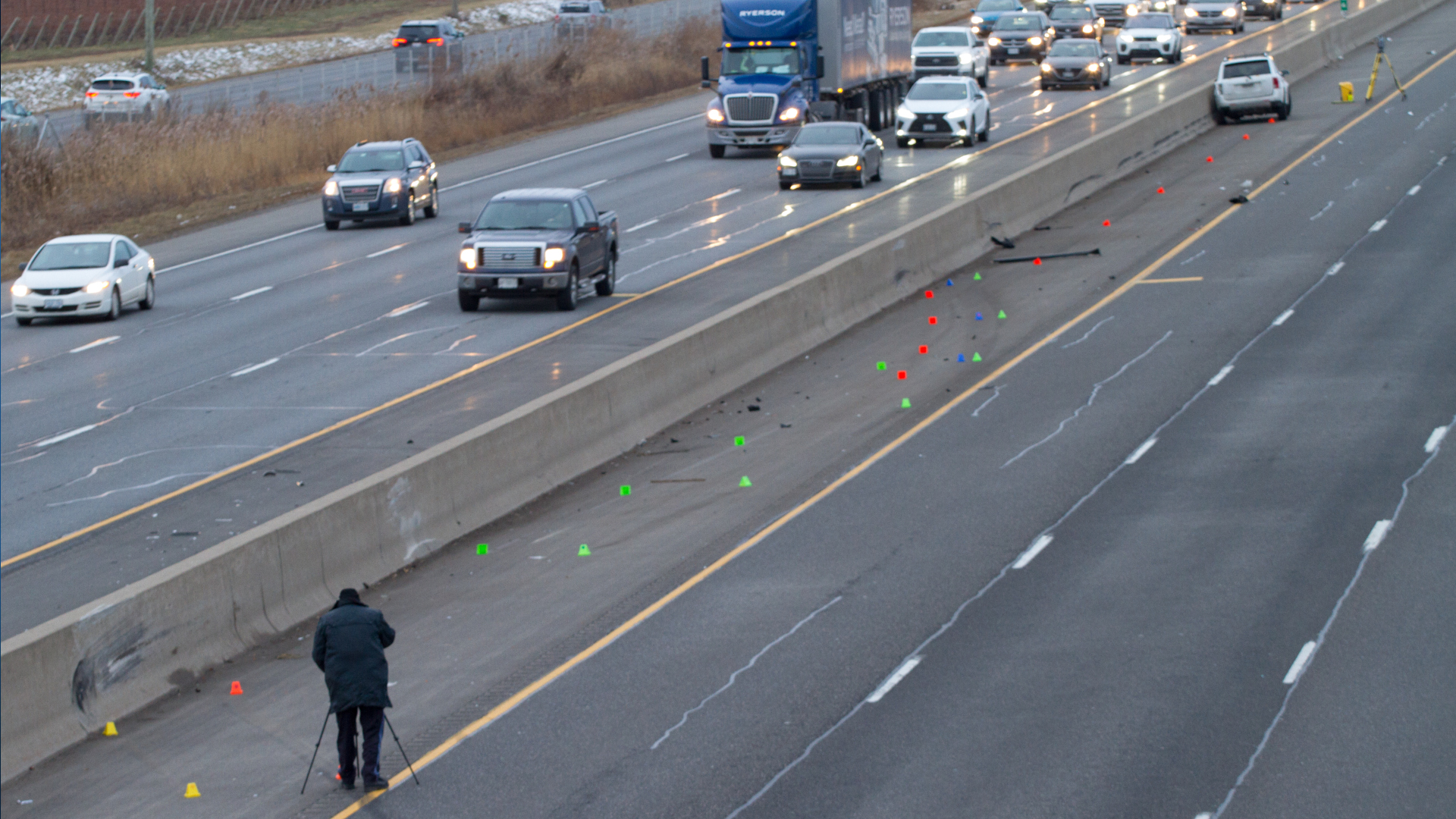Sergeant Kerry Schmidt told Global News that investigators were looking for a light-coloured Hyundai or Kia and a white commercial vehicle both travelling in Toronto-bound lanes of the QEW.