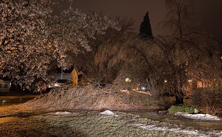 Global News observed several trees and tree branches coated with ice down at several properties. Ice could be seen coating area street signs as well.