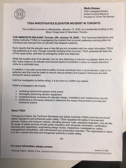 “Early reports that the elevator was in free fall are not consistent with the initial information TSSA has gathered up to now,” a statement read.