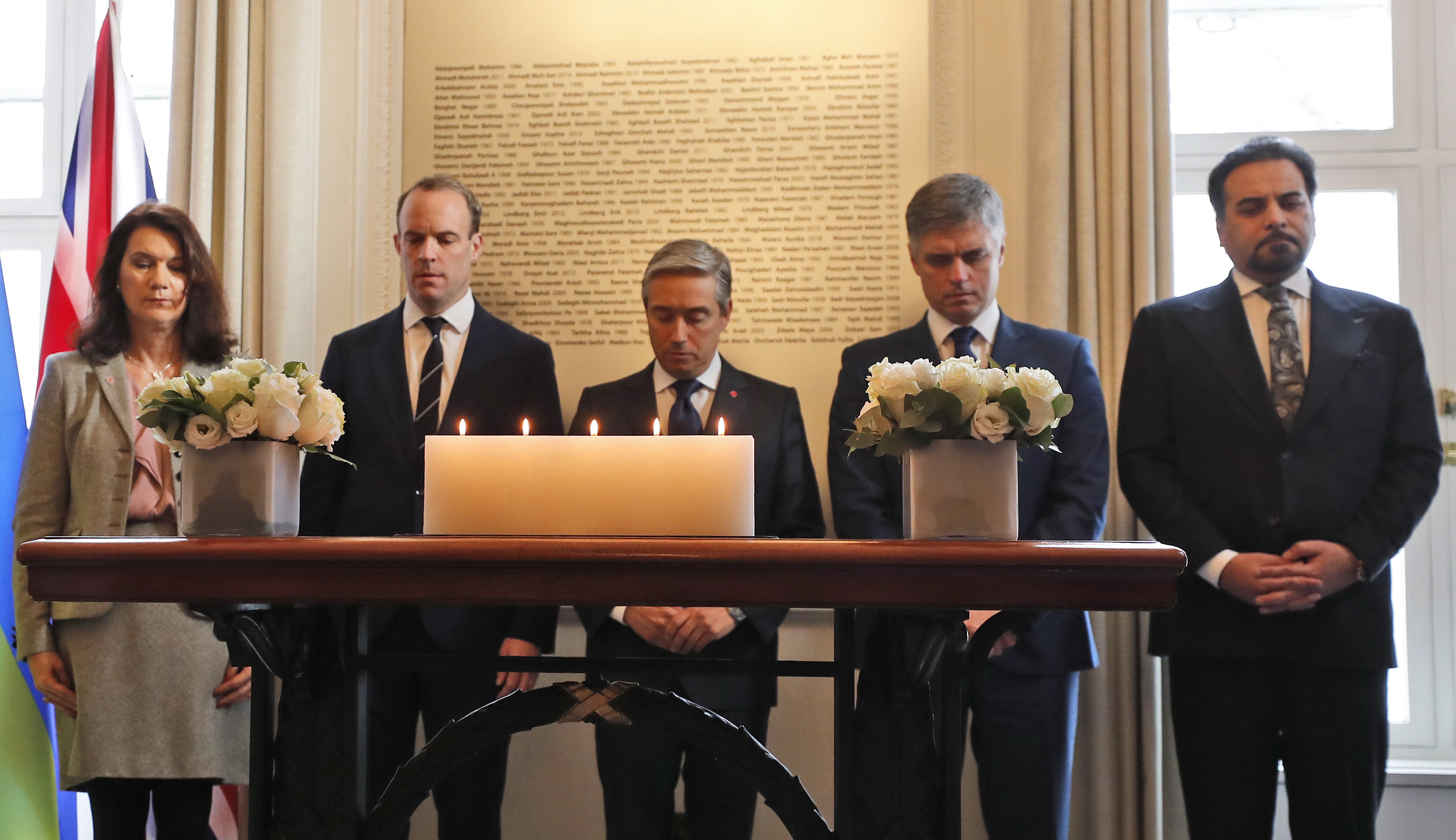 Champagne led the four ministers down a grand staircase, past flags from their countries to a podium where each lit one candle in quiet succession. The ministers then stood shoulder to shoulder behind the flickering flames to lead a moment of silence.