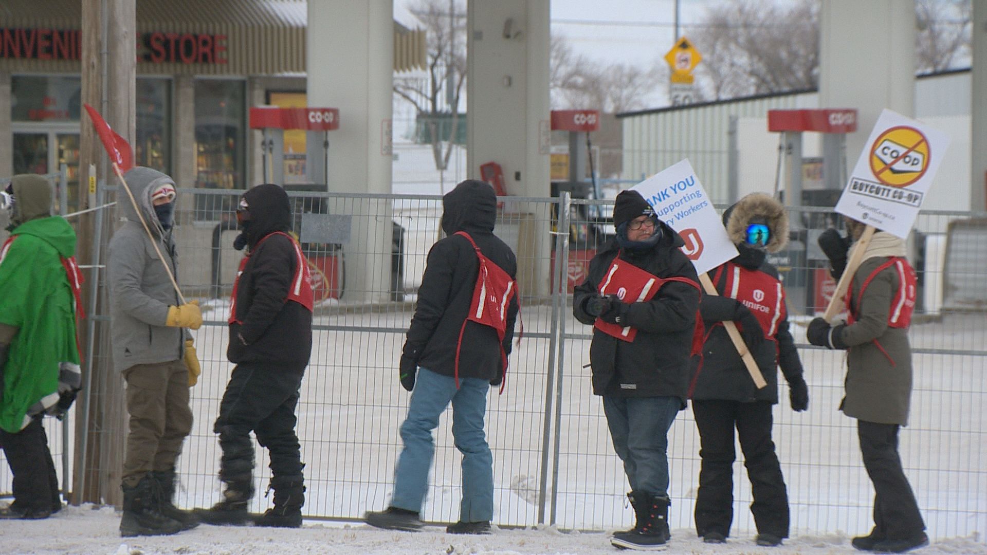 At 4 a.m. Thursday morning, members of Unifor 594 put up fences around the Sherwood Co-op Home Centre and Gas Bar in Regina.