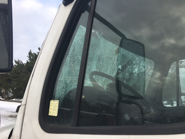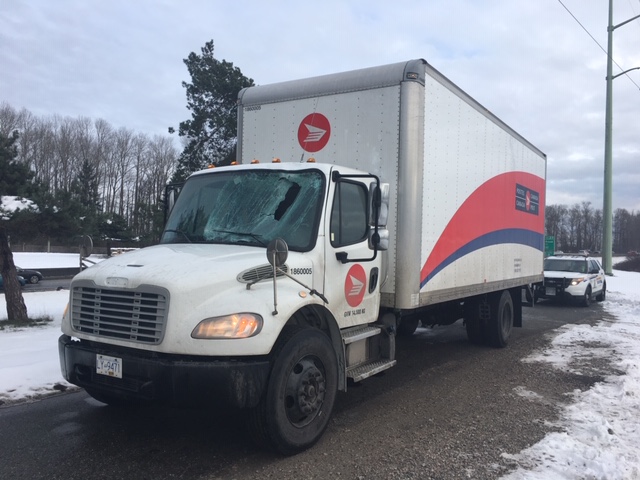 Pictures of the Canada Post truck show a massive hole through the driver’s side of the windshield.