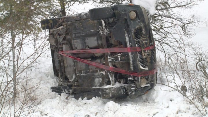 The vehicle suffered heavy damage in the accident, including a smashed-in front window.
