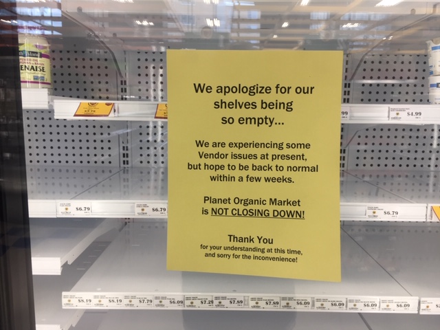 One Planet Organic location in downtown Edmonton posted a sign inside the store apologizing, writing: “We are experiencing some vendor issues at present but hope to be back to normal within a few weeks. Planet Organic is NOT CLOSING DOWN!”