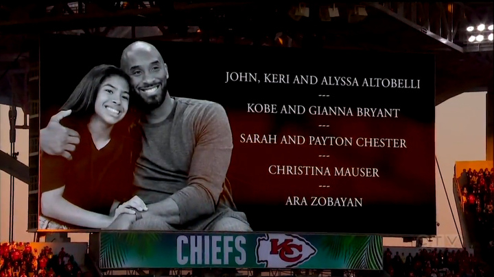 The San Francisco 49ers and the Kansas City Chiefs players lined up at the 24-yard line for a moment of silence for Bryant, Gianna and the other victims that lost their lives in the crash: John Kerri and Alyssa Altobelli, Sarah and Payton Chester, Christina Mauser and pilot Ara Zobayan.