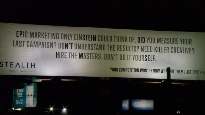 Stealth Media is responsible for the billboard which highlights a hidden message that read, “Epstein didn’t kill himself.”