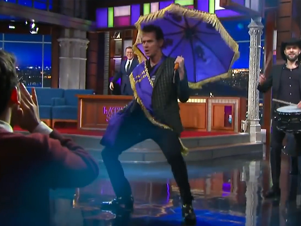 Accompanied by the Late Show house band Stay Human and its frontman Jon Batiste, Carrey, 58, danced his way through the audience with a purple umbrella in hand as he threw golden, sparkling confetti into the crowd and thrust his way back to Colbert.