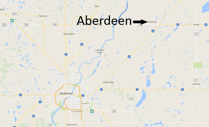 Aberdeen is roughly 35 kilometres northeast of Saskatoon.
