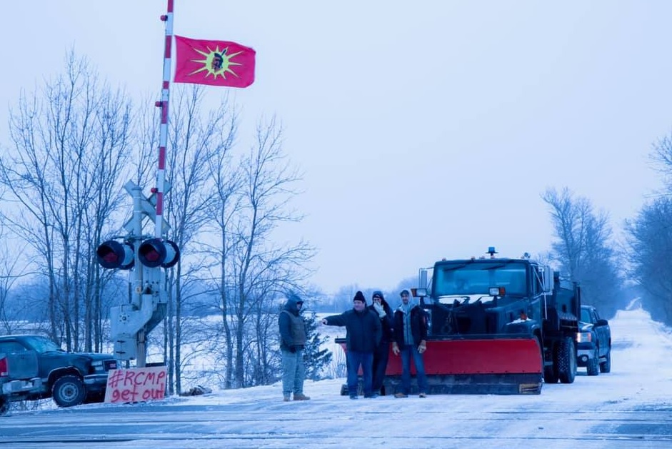 The protesters have raised flags and put up a sign reading “RCMP get out” and “Indian land.”