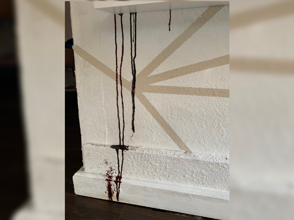 The footage scans the wall starting at the ceiling, showing drops of a dark-red liquid.