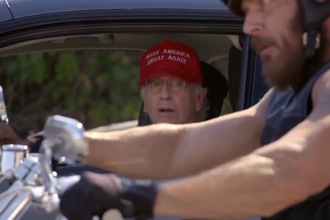U.S. President Donald Trump just made irony great again by tweeting an out-of-context clip from the HBO show Curb Your Enthusiasm in which Larry David uses Trump’s signature MAGA hat to avoid a dust-up with an angry biker.