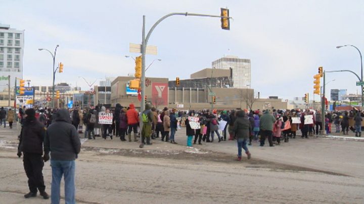The demonstration began shortly before 5 p.m. Members of the Saskatoon Police Service (SPS) traffic unit worked to redirect motorists as the crowd moved through the downtown.