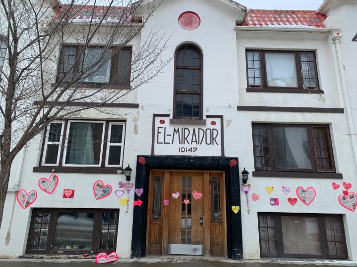 Love notes were posted across the front of the El Mirador apartment building in Edmonton on Saturday.