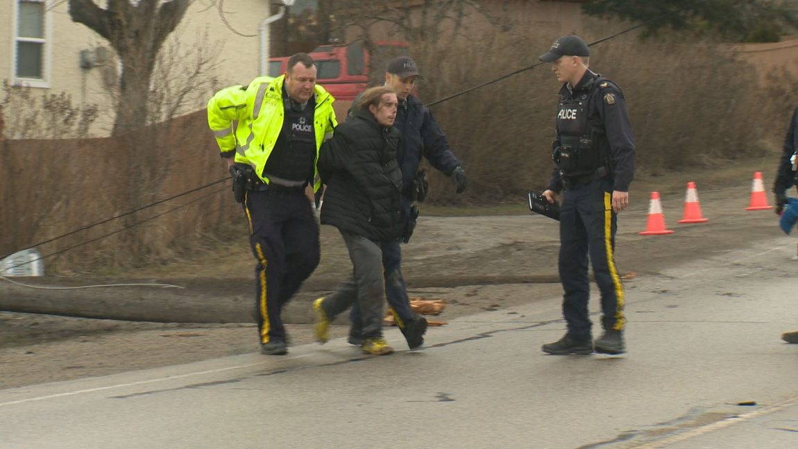 As RCMP demanded he walk toward them away from the power lines, the suspect ignored their direction, prompting an officer to jump in and take him to the ground for handcuffing.