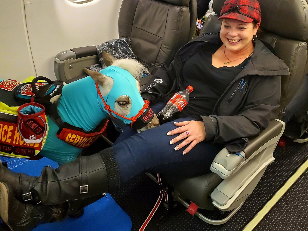 In a photo shared to her Twitter account, Froeser can be seen smiling on a plane seat, with Fred by her side. The mini horse wore a light-blue protective suit with a harness reading “service horse.”