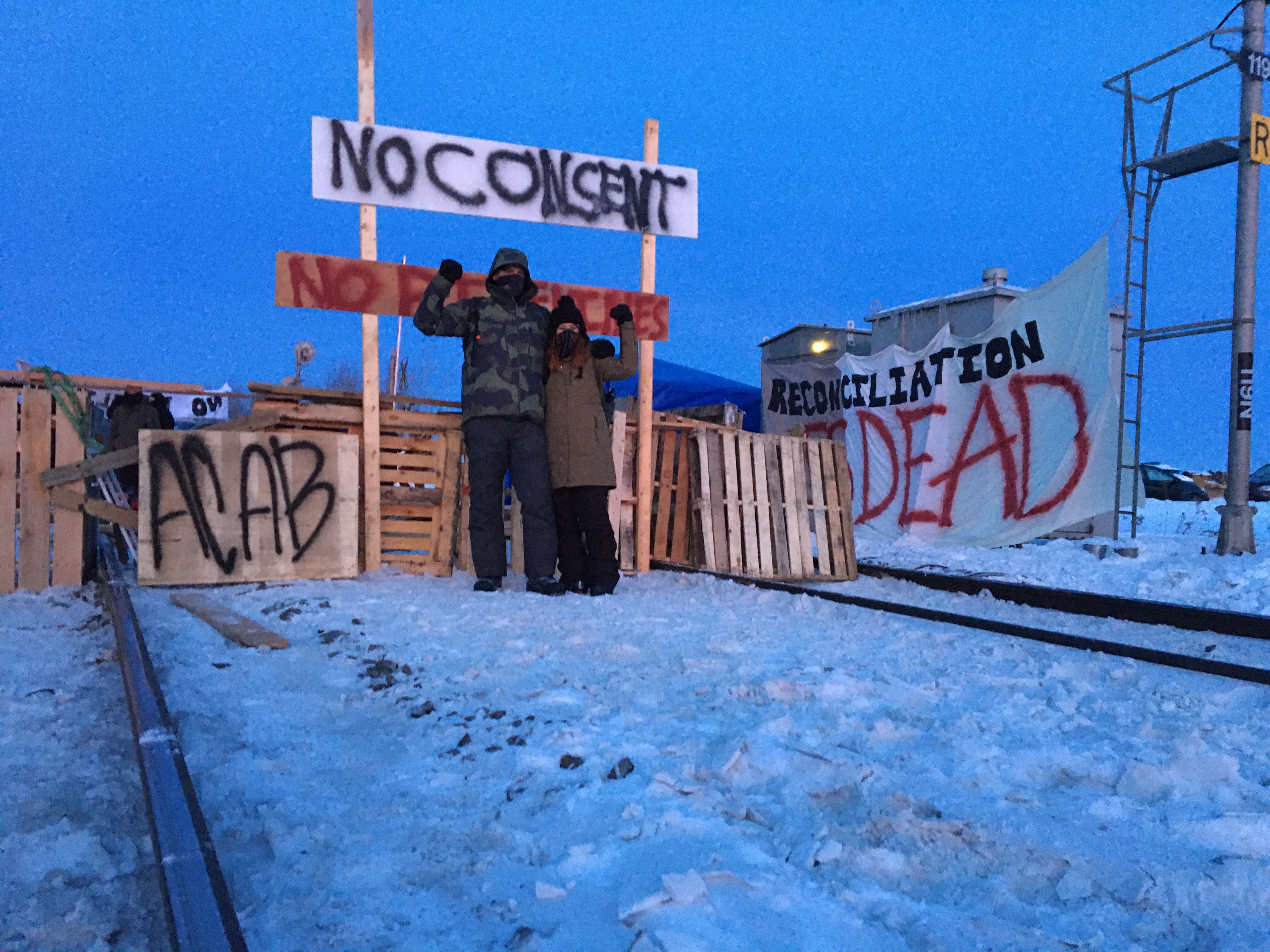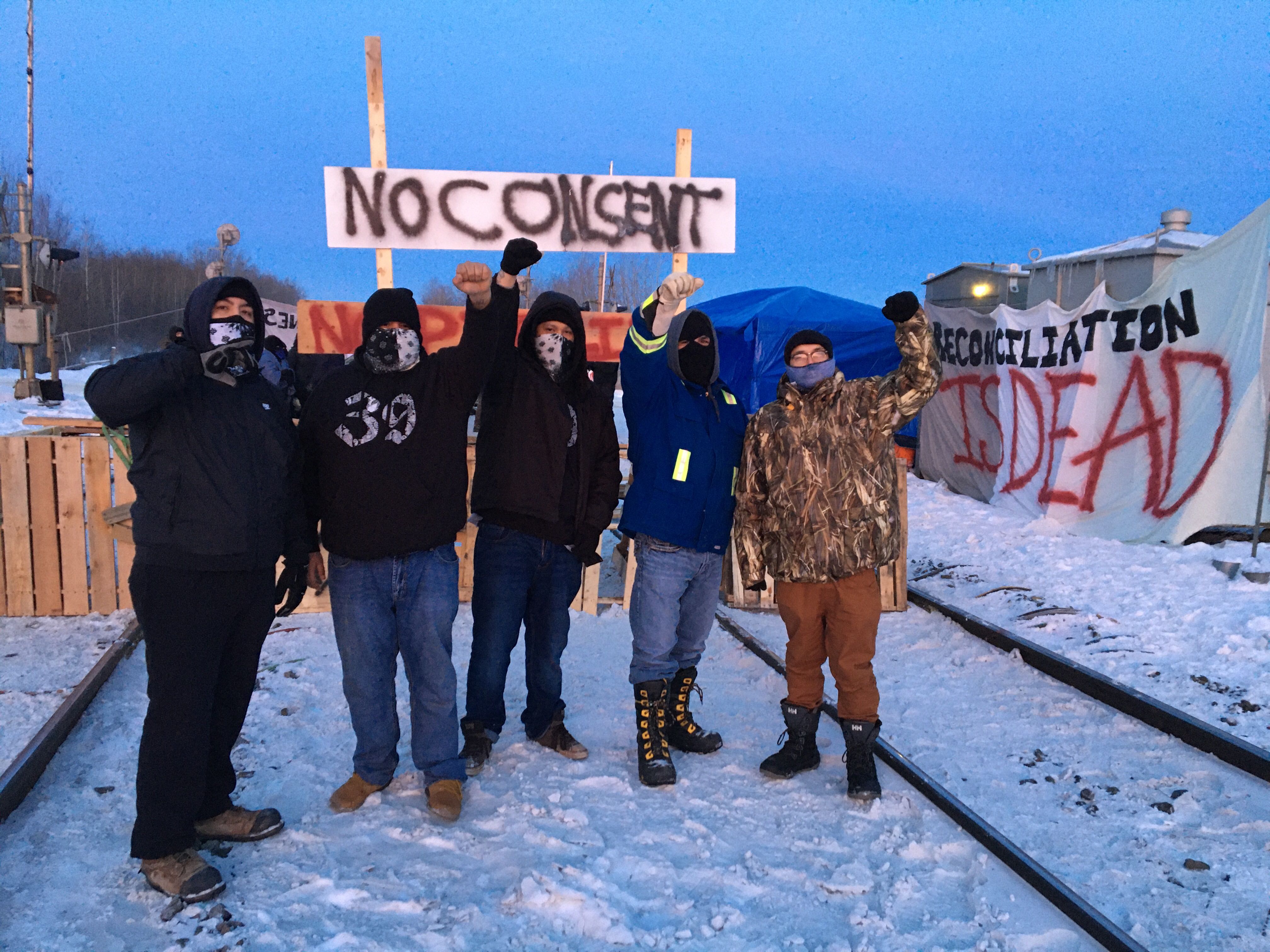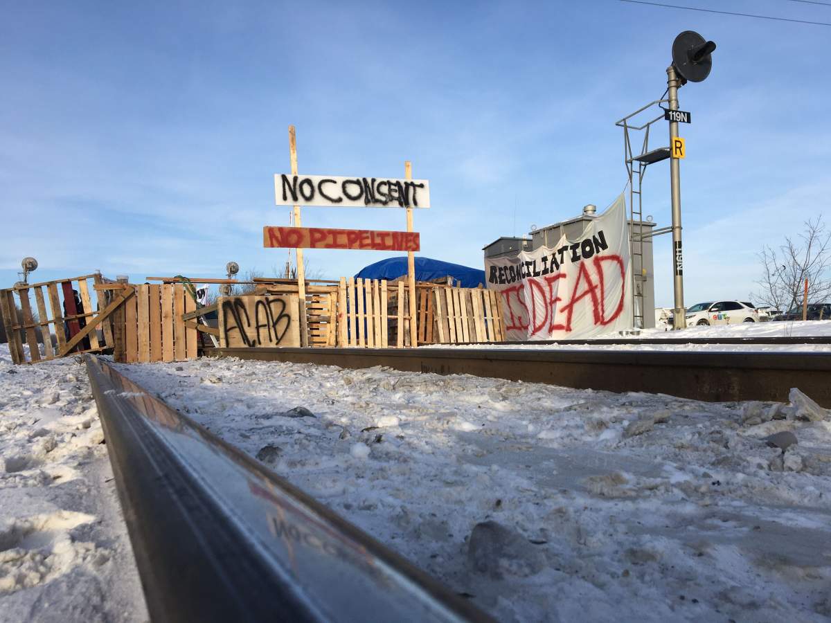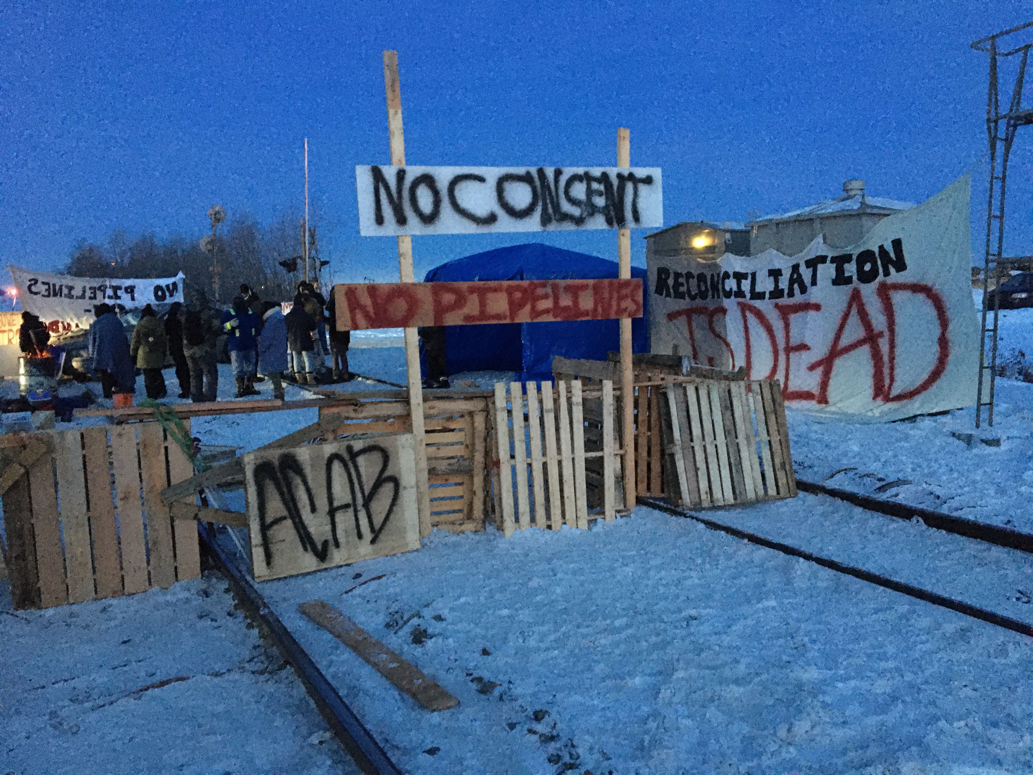 A car and several pallets were used to block the rail line as about 30 protesters gathered. They put up signs which read “Wet’suwet’en strong,” “reconciliation is dead” and “we protect us.”