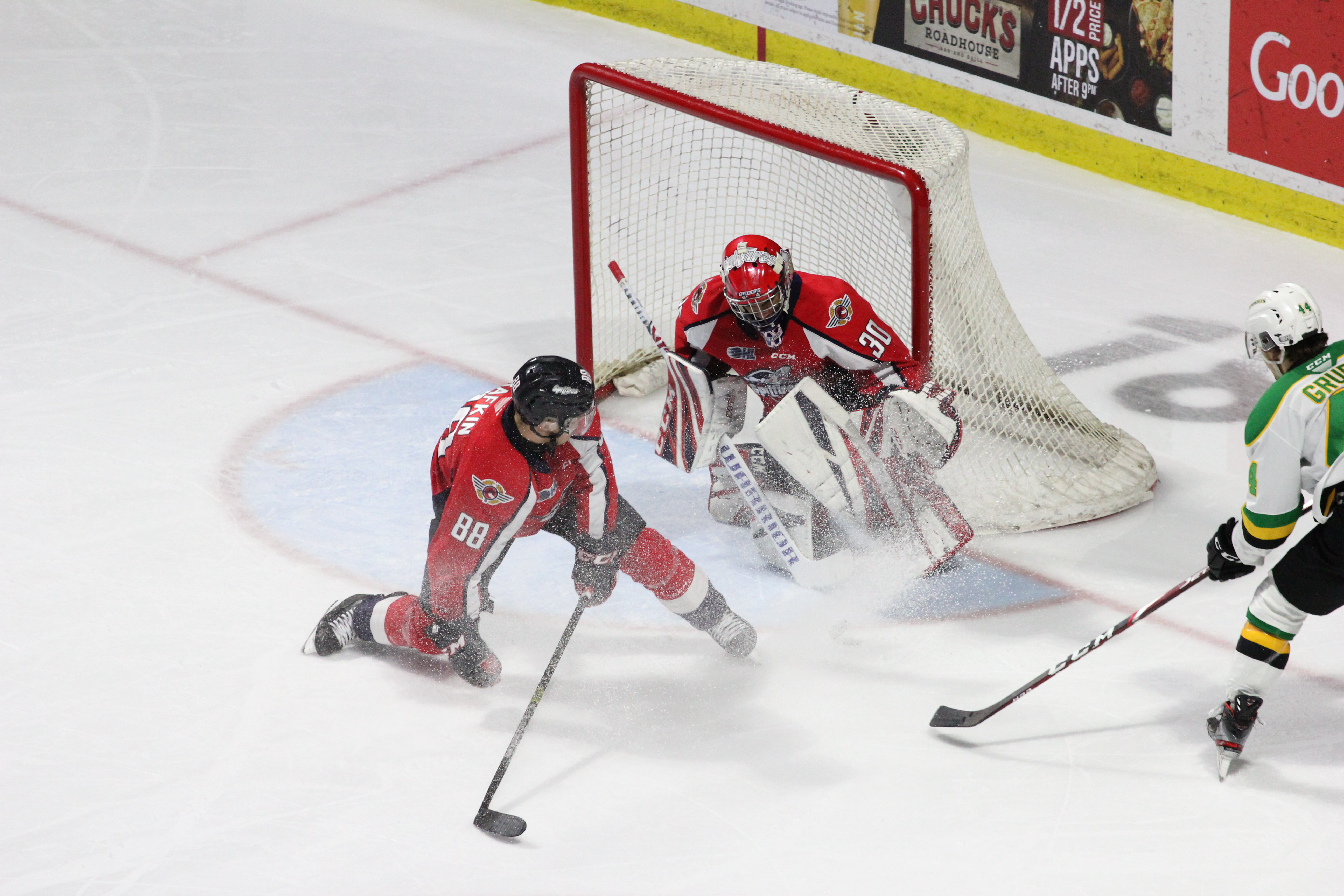 Windsor forward Tyler Angle took a pass in the slot and fired a shot at the Knight net. Brochu reached out his arm and knocked the puck away and seconds later, Connor McMichael took a pass from Liam Foudy and scored his 41st goal into the empty Spitfire net.