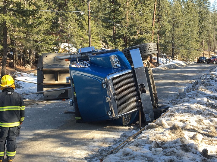 A dump truck flipped on its side in the Central Okanagan on Thursday after its upright box caught some overhead wires.