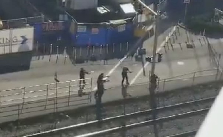 Video from the scene shows a group of officers approaching the man with weapons drawn.