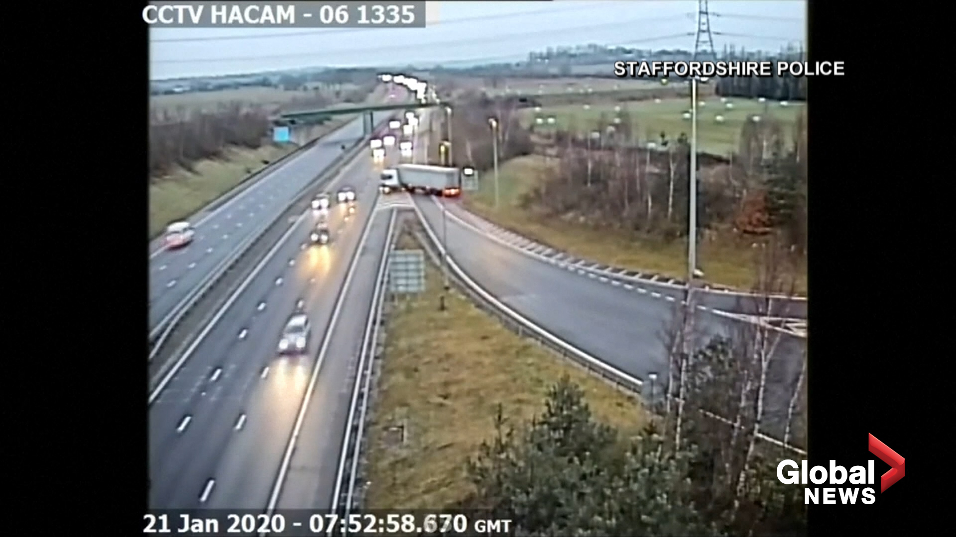 A lorry driver made a dangerous U-turn onto Britain’s M6 motorway, CCTV video uploaded by Staffordshire Police on Friday showed.